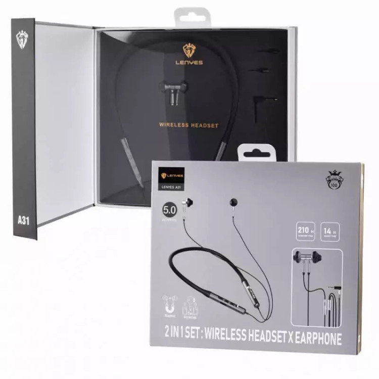 هندزفری بلوتوثی گردنی A31 مارک LENYES داری قابلیت جدا شدن سری های هندزفری امکان استفاده هم بصورت بلوتوث هم بصورت سیمی باطری170mha زمان مکالمه ۱۲ساعت زمان پخش موزیک۱۴ساعت زمان شارژدهی بیش از۲۱۰ساعت